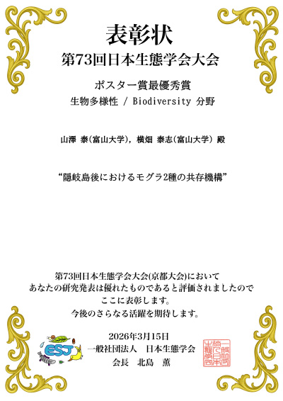 第73回 日本生態学会大会(3月11日~15日)にて、理工学研究科理工学専攻博士前期課程2年の山澤泰さん(横畑研究室)が、生物多様性部門において「最優秀ポスター賞」を受賞しました。
